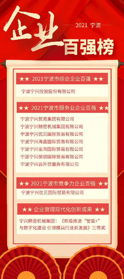 Recently, Ningbo Enterprises Confederation, Entrepreneurs Association and Federation of Industrial Economics jointly released the list of 2021 Ningbo Top 100 Enterprises. Ningshing Holdings was continuously awarded “2021 Ningbo Top 100 Comprehensive Enterprises”. The subsidiaries of Ningshing Holdings, including Ningshing Trading Group, Ningshing Precision Machinery Group, Ningshing Ubay, Ningshing Haixin, Ningshing Kinhil, Ningshing Hench and Ningshing Cloud were also awarded “2021 Ningbo Top 100 Enterprises in Service Industry”. Ningshing Ubay also awarded “2021 Ningbo Top 100 Enterprises in Competitiveness”. The management mode named Actively promote "smart+"and digital construction to lead the new development of mold industry by Ningshing Precision Machinery Group won the third prize of 2021 Ningbo Modernized & Innovative Enterprise Management Achievement.