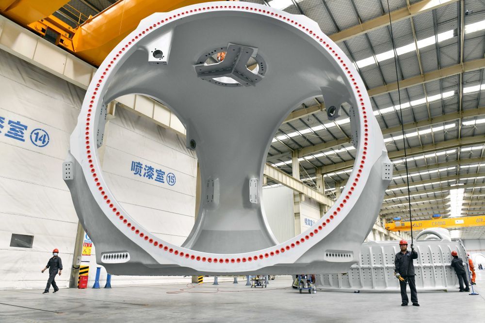 工作人員在山東省惠民縣風(fēng)電裝備產(chǎn)業(yè)基地一涂裝車間內(nèi)作業(yè)(2022年6月7日攝)。新華社記者 郭緒雷 攝