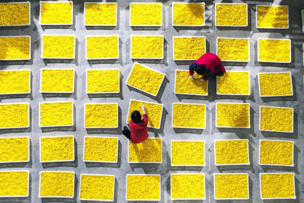村民在貴州省貴定縣云霧鎮(zhèn)一菊花加工車間攤晾金絲皇菊(2022年10月20日攝,無人機(jī)照片)。新華社記者 楊文斌 攝