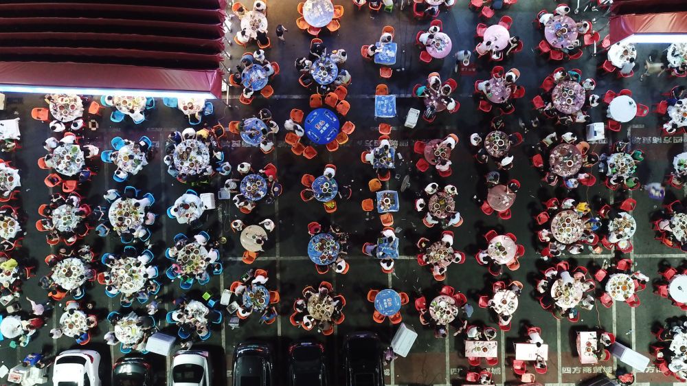 游客在湖南長(zhǎng)沙四方坪夜市就餐(2022年7月29日攝,無人機(jī)照片)。新華社記者 陳振海 攝