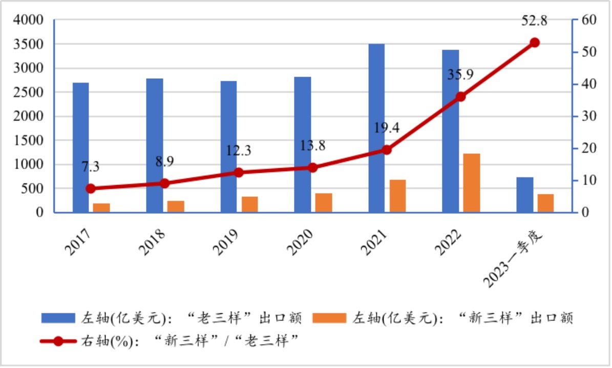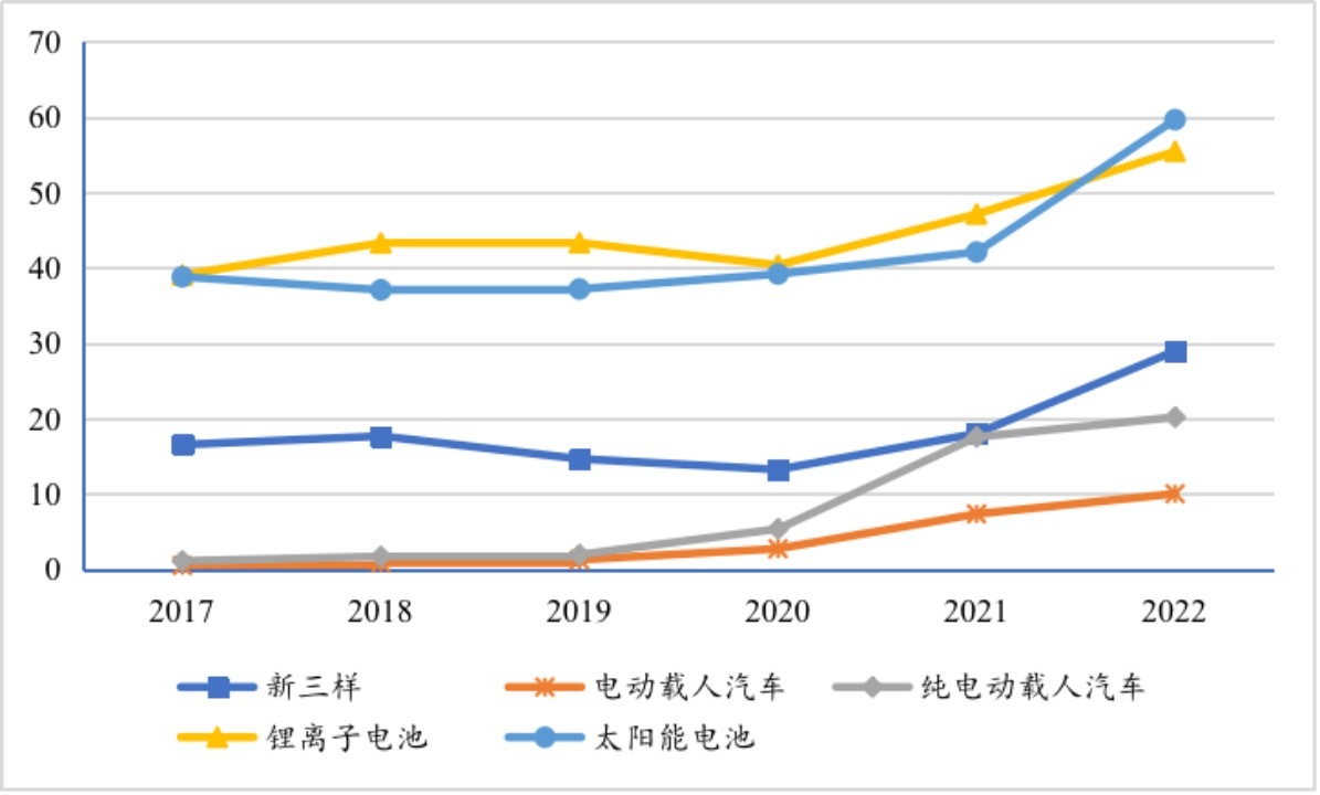 2017年,我國“新三樣”和“老三樣”的出口額分別為196.3億美元和2687.7億美元,“新三樣”與“老三樣”出口額的比值為7.3%。到2022年,二者的出口額分別為1214.2億美元和3380.0億美元,新與老的比值已經(jīng)增加至35.9%。